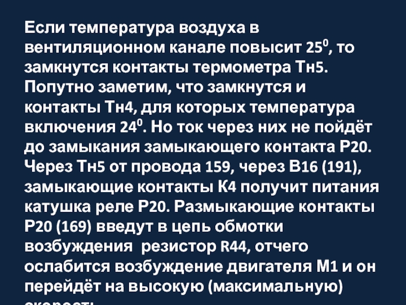 для которых температура включения 240. Но ток через них не пойдёт до замыкания замыкающего контакта Р20. Через Тн5 от провода 159, через В16 (191), замыкающие контакты К4 получит питания катушка реле Р20. Размыкающие контакты Р20 (169) введут в цепь обмотки возбуждения резистор R44, отчего ослабится возбуждение двигателя М1 и он перейдёт на высокую (максимальную) скорость.