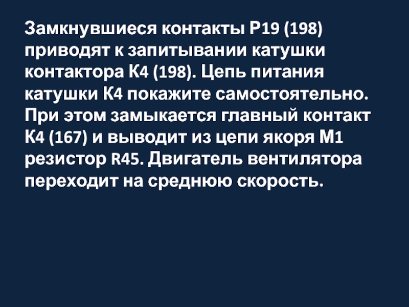 Слайд 7Замкнувшиеся контакты Р19 (198) приводят к запитывании катушки контактора К4