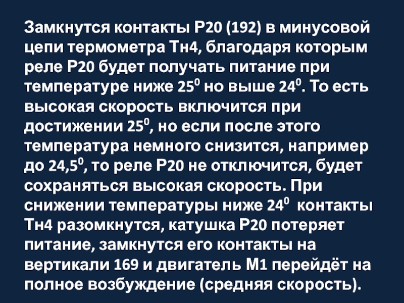 но выше 240. То есть высокая скорость включится при достижении 250, но если после этого температура немного снизится, например до 24,50, то реле Р20 не отключится, будет сохраняться высокая скорость. При снижении температуры ниже 240 контакты Тн4 разомкнутся, катушка Р20 потеряет питание, замкнутся его контакты на вертикали 169 и двигатель М1 перейдёт на полное возбуждение (средняя скорость).