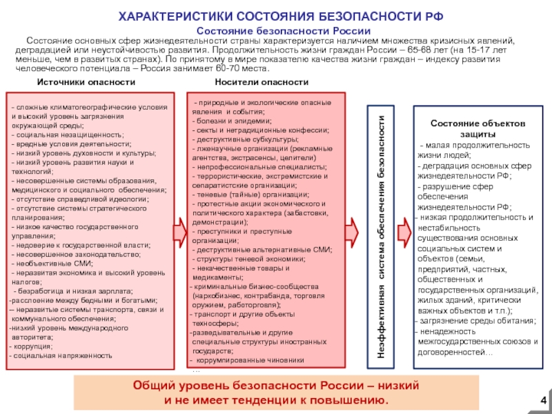 Низкий уровень безопасности РФ оказывает негативное влияние на экономическое и социальное развитие страны, приводит к нерациональному расходованию природных ресурсов, снижению международного престижа России, ослаблению обороноспособности государства, снижению качества жизни российских граждан, уменьшению численности населения страны, ослаблению духовно-нравственных основ общества и потенциала государства.