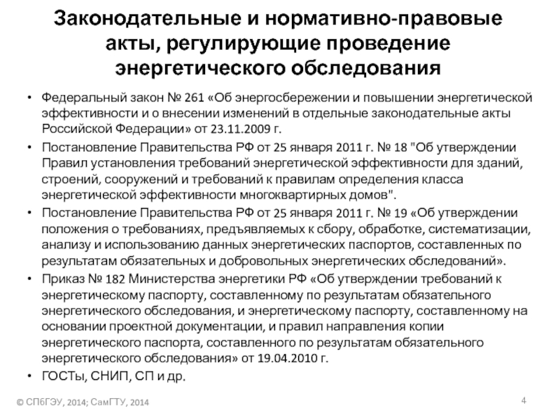 Постановление Правительства РФ от 25 января 2011 г. № 19 «Об утверждении положения о требованиях, предъявляемых к сбору, обработке, систематизации, анализу и использованию данных энергетических паспортов, составленных по результатам обязательных и добровольных энергетических обследований».