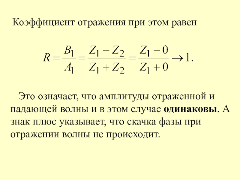 Коэффициент отражения при этом равенЭто означает, что амплитуда отраженной и падающей волны одинаковы. А знак минусуказывает, как