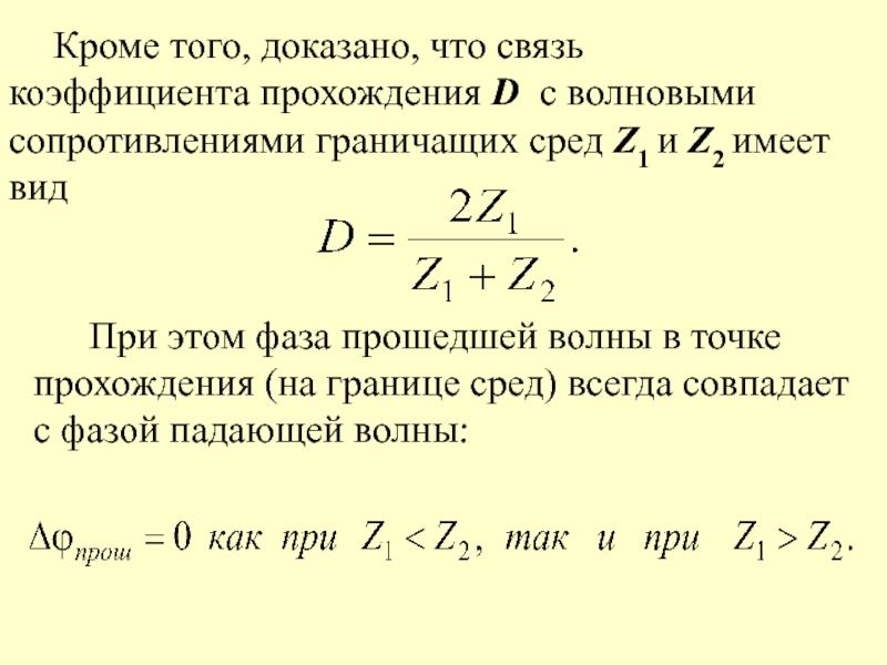 Кроме того, доказано, что связь коэффициента прохождения D с волновыми сопротивлениями граничащих сред Z1 и Z2 имеет