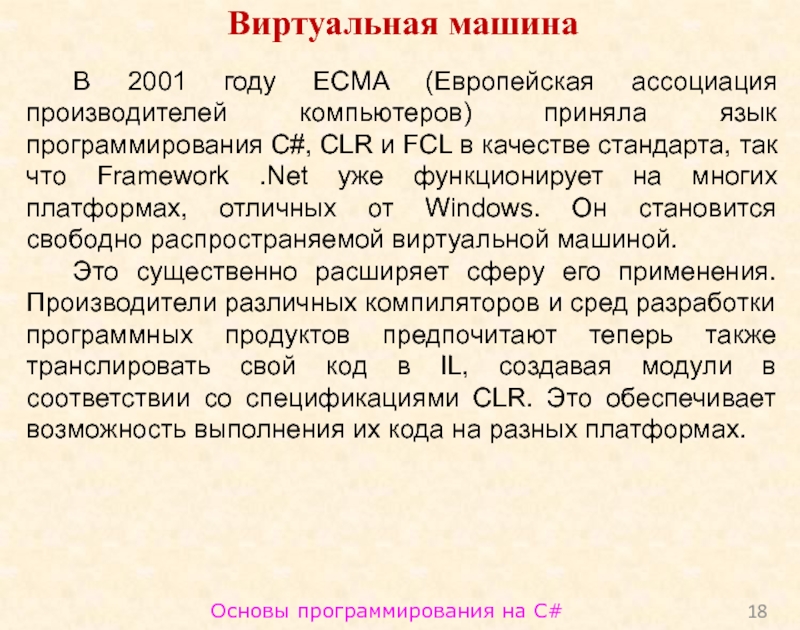 благодаря каркасу Framework .Net, ставшему надстройкой над операционной системой, программисты C# получают те же преимущества работы с виртуальной машиной, что и программисты Java;