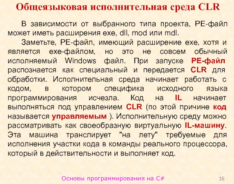 Заметьте, PE-файл, имеющий расширение exe, хотя и является exe-файлом, но это не совсем обычный исполняемый Windows файл. При запуске PE-файл распознается как специальный и передается CLR для обработки. Исполнительная среда начинает работать с кодом, в котором специфика исходного языка программирования исчезла. Код на IL начинает выполняться под управлением CLR (по этой причине код называется управляемым ). Исполнительную среду можно рассматривать как своеобразную виртуальную IL-машину. Эта машина транслирует "на лету" требуемые для исполнения участки кода в команды реального процессора, который в действительности и выполняет код.