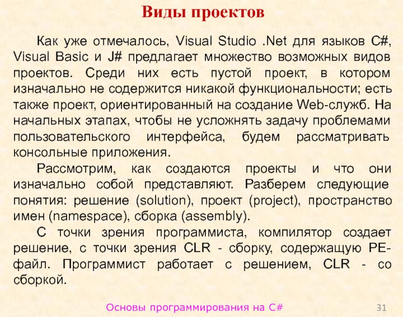 Помимо структуризации, это дает возможность присваивать классам имена, не задумываясь об их уникальности. В разных пространствах имен могут существовать одноименные классы. Проект - это основная единица, с которой работает программист. Он выбирает тип проекта, а Visual Studio создает скелет проекта в соответствии с выбранным типом.