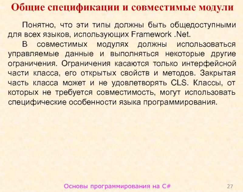 языках, мирно уживались в рамках одного приложения, для их бесшовной отладки и возможности построения разноязычных потомков они должны удовлетворять некоторым ограничениям. Эти ограничения задаются набором общеязыковых спецификаций - CLS (Common Language Specification). Класс, удовлетворяющий спецификациям CLS, называется CLS-совместимым. Он доступен для использования в других языках, классы которых могут быть клиентами или наследниками совместимого класса.