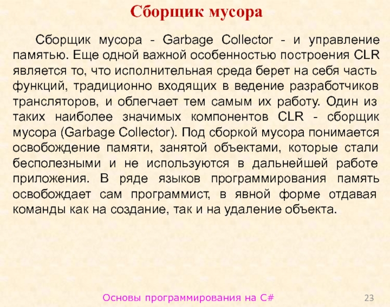 то, что исполнительная среда берет на себя часть функций, традиционно входящих в ведение разработчиков трансляторов, и облегчает тем самым их работу. Один из таких наиболее значимых компонентов CLR - сборщик мусора (Garbage Collector). Под сборкой мусора понимается освобождение памяти, занятой объектами, которые стали бесполезными и не используются в дальнейшей работе приложения. В ряде языков программирования память освобождает сам программист, в явной форме отдавая команды как на создание, так и на удаление объекта.