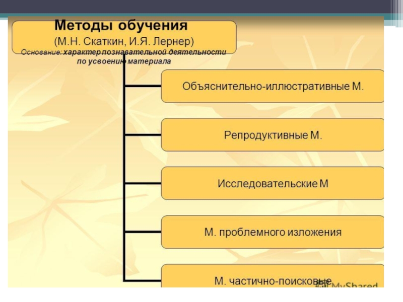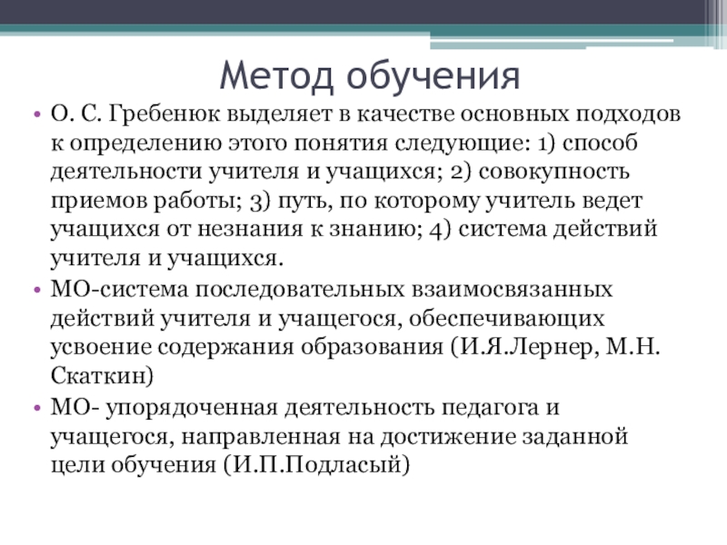 2) совокупность приемов работы; 3) путь, по которому учитель ведет учащихся от незнания к знанию; 4) система действий учителя и учащихся.МО-система последовательных взаимосвязанных действий учителя и учащегося, обеспечивающих усвоение содержания образования (И.Я.Лернер, М.Н.Скаткин)