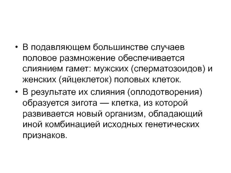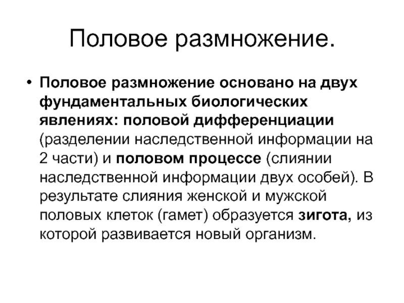 (слиянии наследственной информации двух особей). В результате слияния женской и мужской половых клеток (гамет) образуется зигота, из которой развивается новый организм.