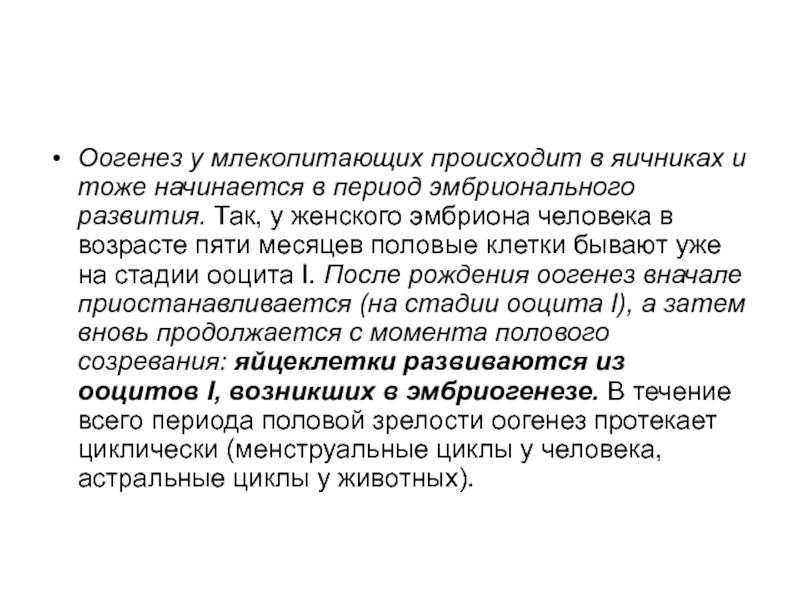 пяти месяцев половые клетки бывают уже на стадии ооцита I. После рождения оогенез вначале приостанавливается (на стадии ооцита I), а затем вновь продолжается с момента полового созревания: яйцеклетки развиваются из ооцитов I, возникших в эмбриогенезе. В течение всего периода половой зрелости оогенез протекает циклически (менструальные циклы у человека, астральные циклы у животных).