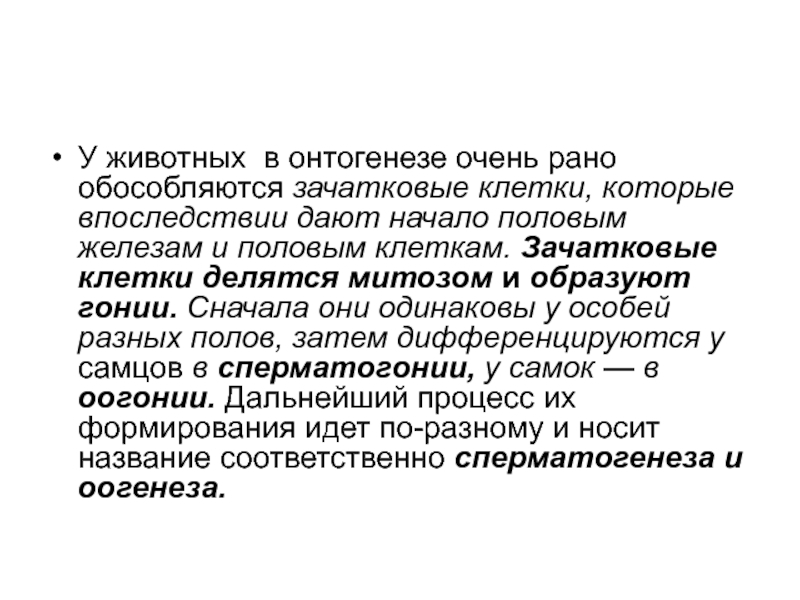 Слайд 29У животных в онтогенезе очень рано обособляются зачатковые клетки, которые