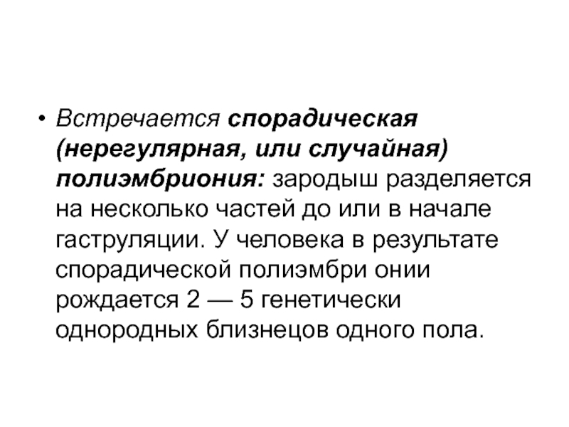 Слайд 17Встречается спорадическая (нерегулярная, или случайная) полиэмбриония: зародыш разделяется на несколько