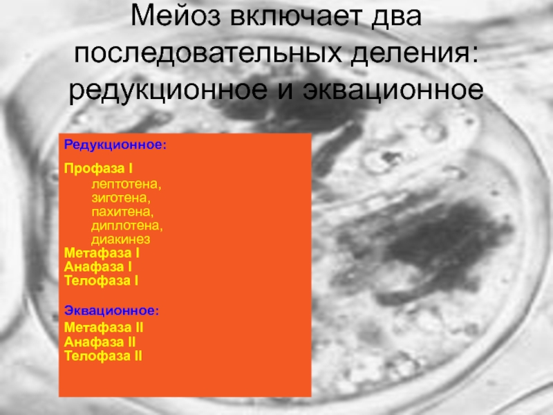 Слайд 33Мейоз включает два последовательных деления: редукционное и эквационное
