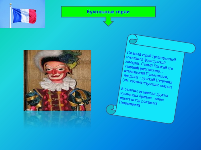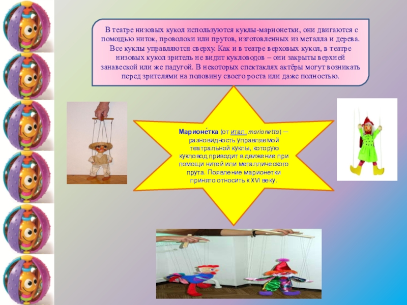 театральной куклы, которую кукловод приводит в движение при помощи нитей или металлического прута. Появление марионетки принято относить к XVI веку.