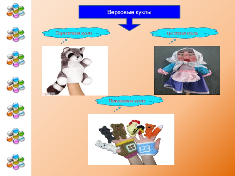 Перчаточная кукла надевается на руку кукловода и управляется пальцами и кистью.