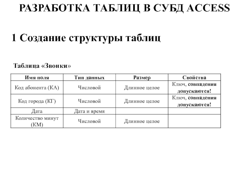Разработка таблиц в СУБД Access1 Создание структуры таблицТаблица «Звонки»