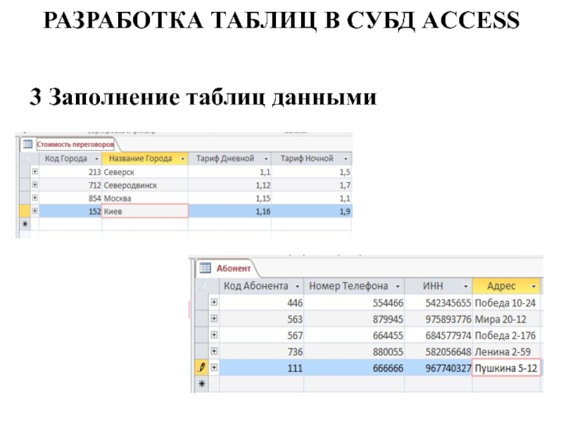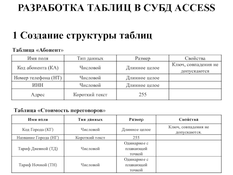 Разработка таблиц в СУБД Access1 Создание структуры таблицТаблица «Абонент»Таблица «Стоимость переговоров»