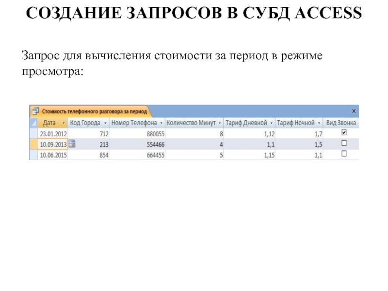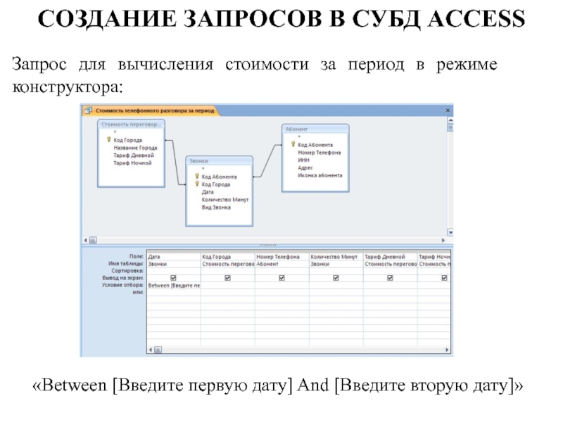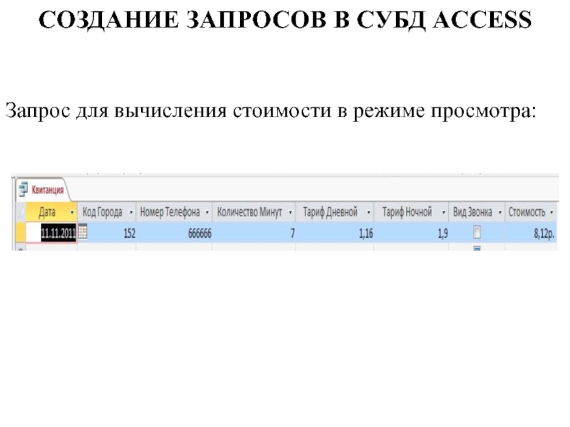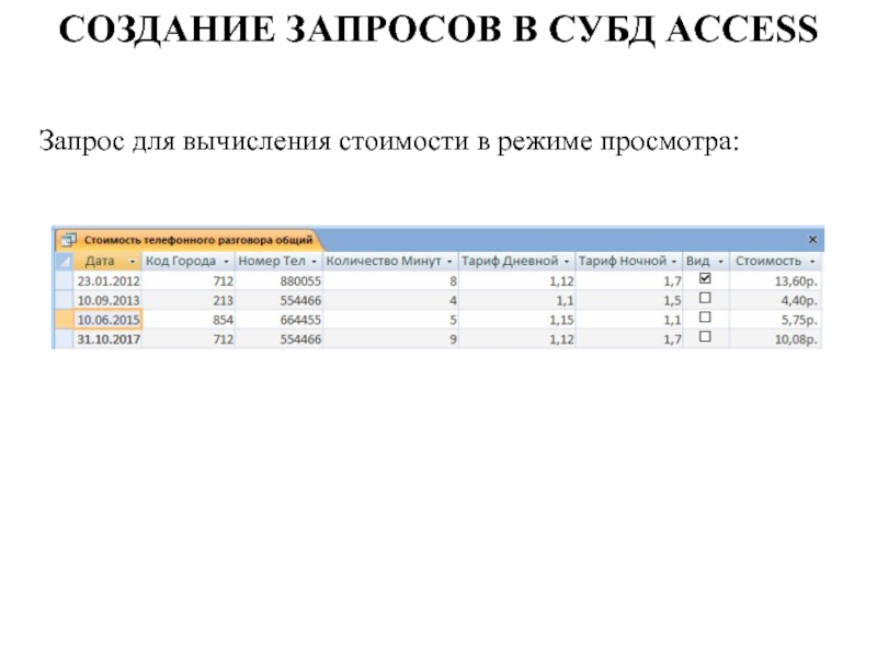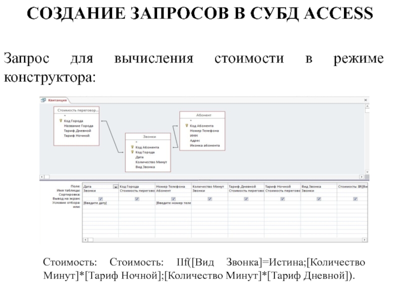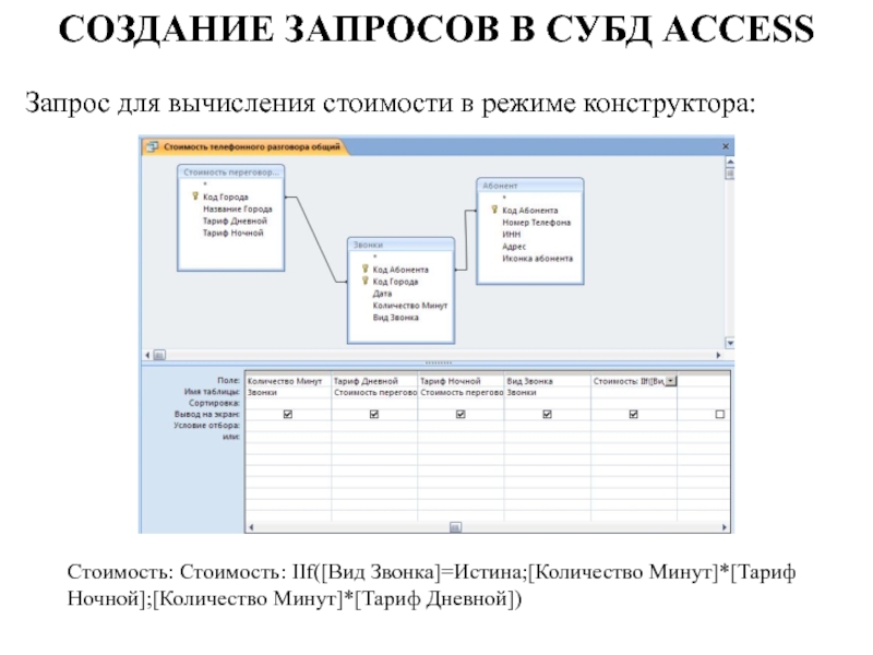 Создание запросов в СУБД AccessЗапрос для вычисления стоимости в режиме конструктора:Стоимость: Стоимость: IIf([Вид Звонка]=Истина;[Количество Минут]*[Тариф Ночной];[Количество Минут]*[Тариф