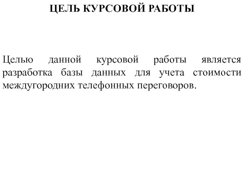 Цель курсовой работыЦелью данной курсовой работы является разработка базы данных для учета стоимости междугородних телефонных переговоров.