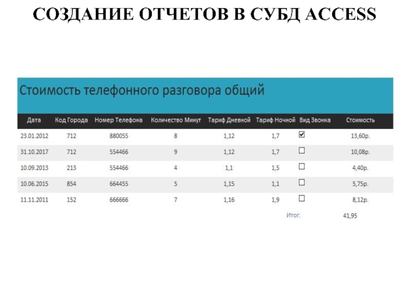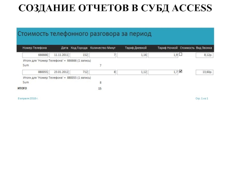 7) созданы необходимые запросы, формы для ввода данных и отчеты для проведения сравнительного анализа стоимости телефонного разговора и стоимости телефонного разговора за период автоматически;