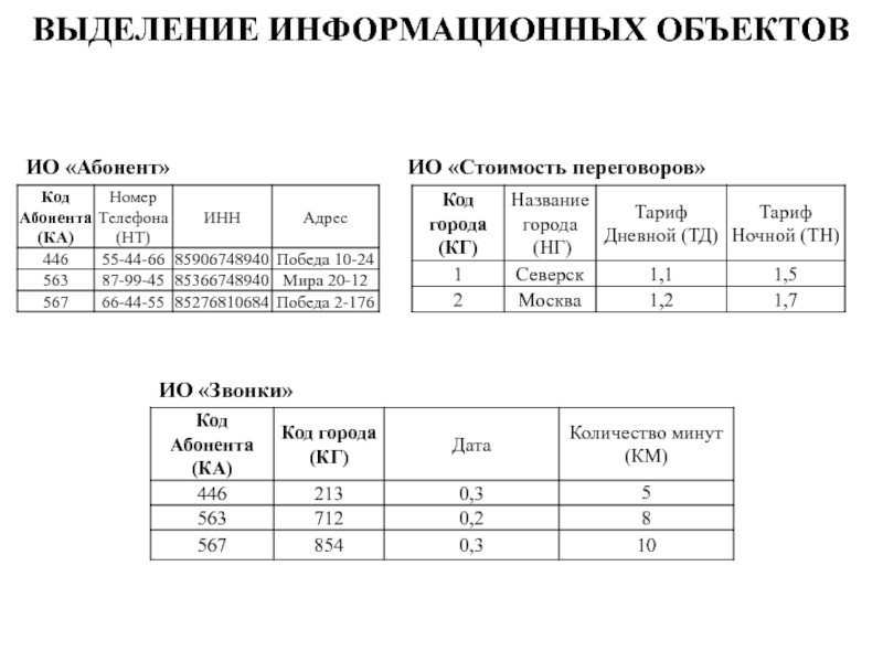 Выделение информационных объектовИО «Абонент»ИО «Стоимость переговоров»ИО «Звонки»