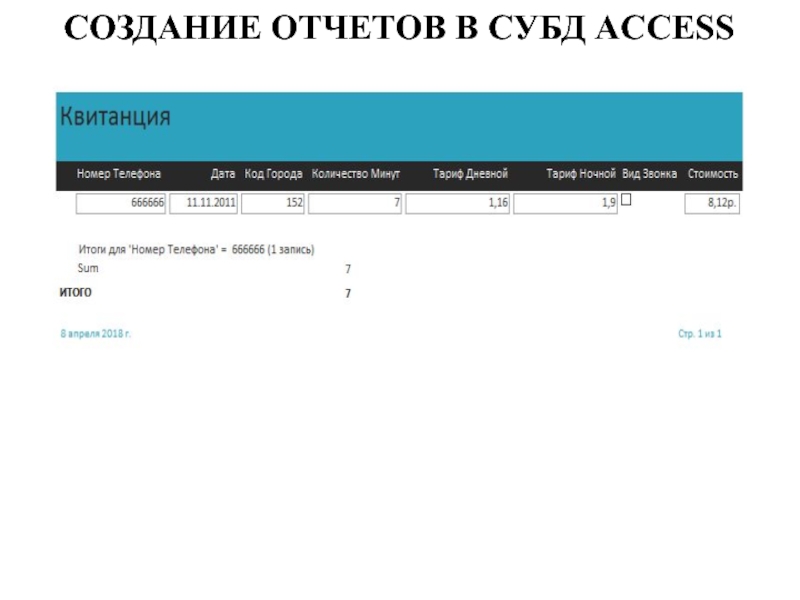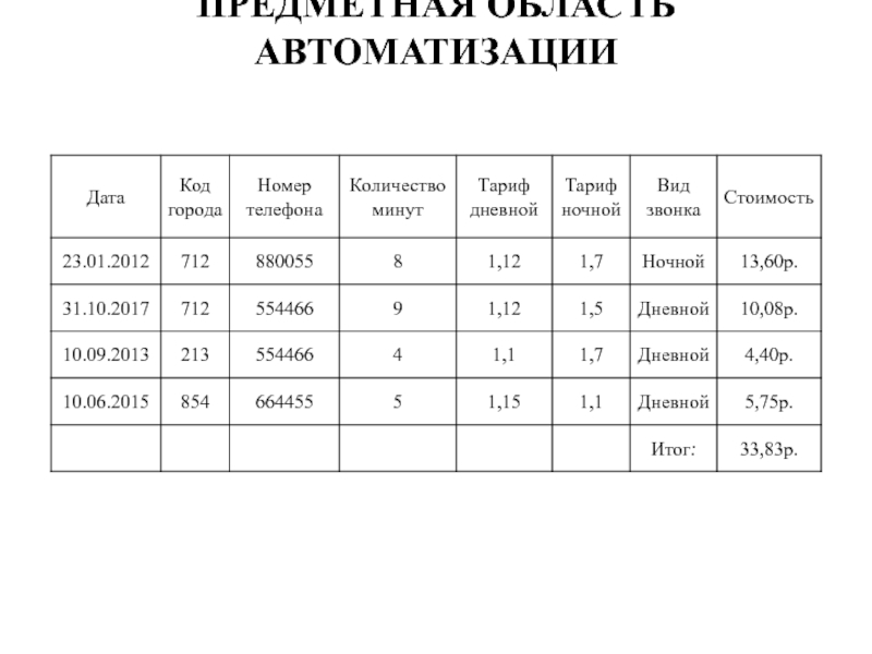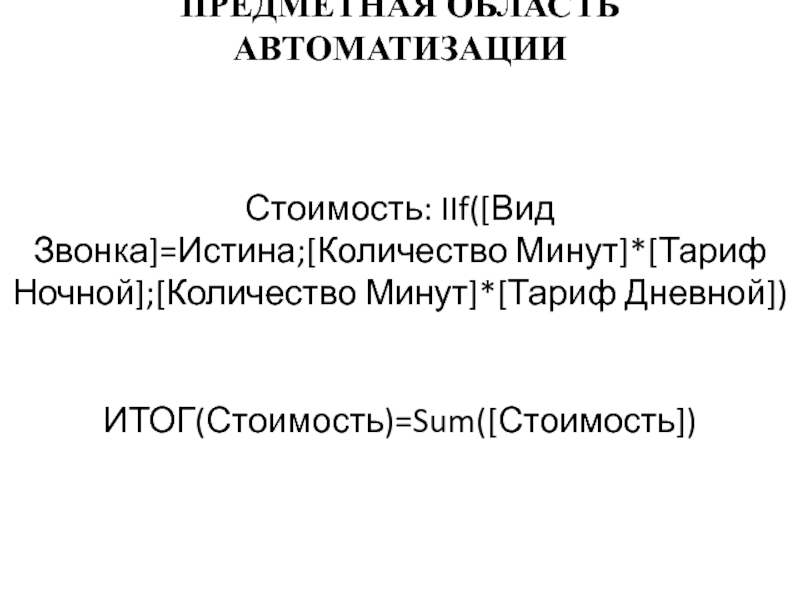 Предметная область автоматизацииСтоимость: IIf([Вид Звонка]=Истина;[Количество Минут]*[Тариф Ночной];[Количество Минут]*[Тариф Дневной])ИТОГ(Стоимость)=Sum([Стоимость])