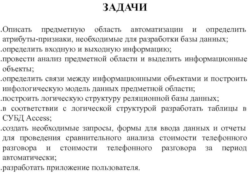 ЗадачиОписать предметную область автоматизации и определить атрибуты-признаки, необходимые для разработки базы данных;определить входную и выходную информацию;провести анализ