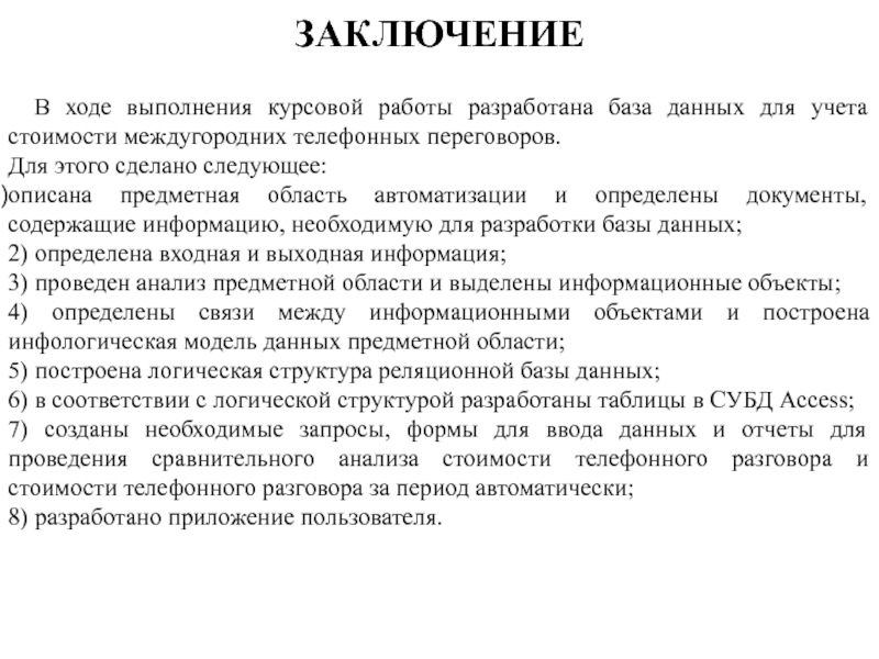 ЗаключениеВ ходе выполнения курсовой работы разработана база данных для учета стоимости междугородних телефонных переговоров.Для этого сделано следующее:описана