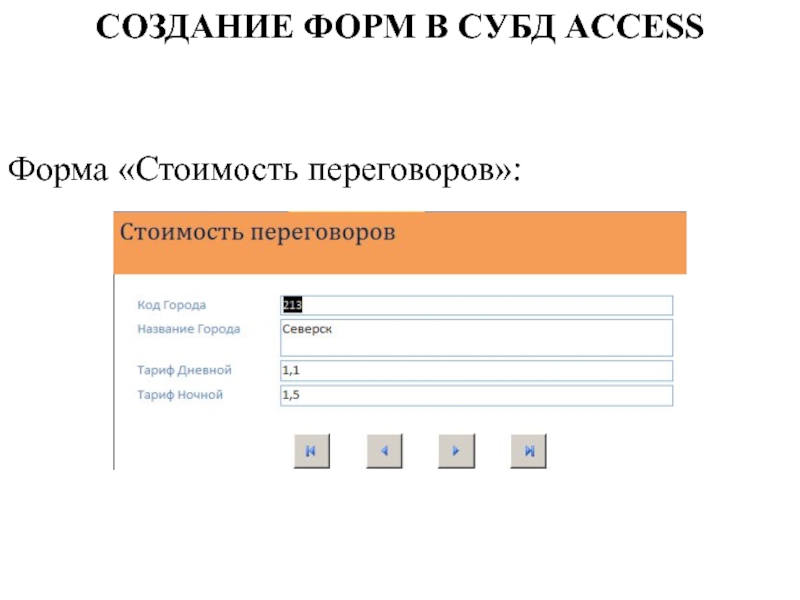 Создание форм в СУБД AccessФорма «Стоимость переговоров»: