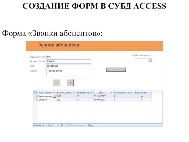 Создание форм в СУБД AccessФорма «Звонки абонентов»: