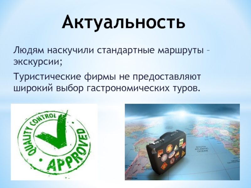 Людям наскучили стандартные маршруты – экскурсии;Туристические фирмы не предоставляют широкий выбор гастрономических туров.Актуальность