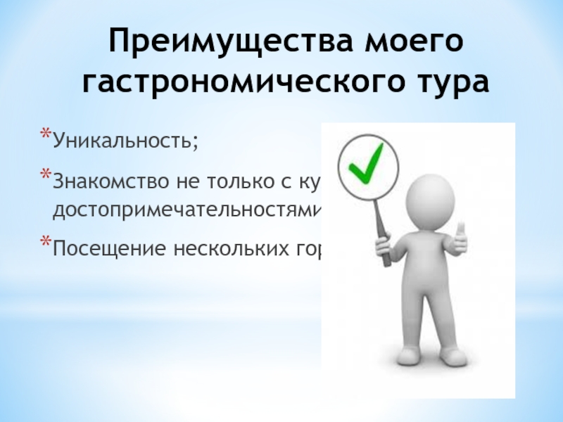 Преимущества моего гастрономического тураУникальность;Знакомство не только с кухней, но и с достопримечательностями страны;Посещение нескольких городов.