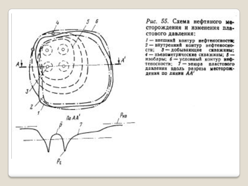 вначале нефти,а затем нефти с водой пластовое давление изменится по сравнению с начальным рко, которое сохранится в водоносной части на некотором, постоянно увеличивающемся удалении от контура нефтеносности. В нижней части этого рисунка показана эпюра пластового давления вдоль разреза пласта по линии АА'. Как видно из этой эпюры, вблизи внешнего и внутреннего 2 контуров нефтеносности пластовое давление резко снижается в результате роста фильтрационного сопротивления при совместной фильтрации нефти и воды, затем плавно изменяется по площади. Вблизи добывающих скважин 3, естественно возникают воронки депрессии и забойное давление в скважинах составляет pc.