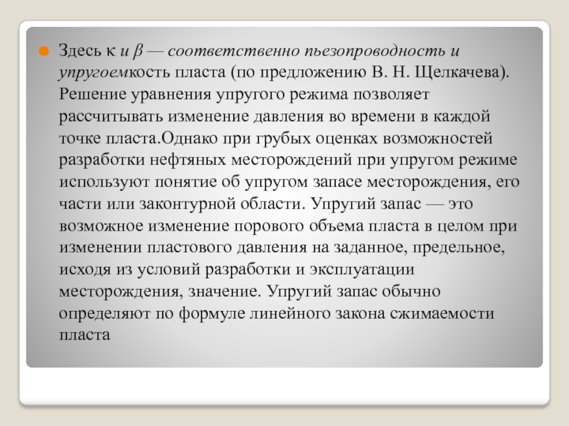 изменение давления во времени в каждой точке пласта.Однако при грубых оценках возможностей разработки нефтяных месторождений при упругом режиме используют понятие об упругом запасе месторождения, его части или законтурной области. Упругий запас — это возможное изменение порового объема пласта в целом при изменении пластового давления на заданное, предельное, исходя из условий разработки и эксплуатации месторождения, значение. Упругий запас обычно определяют по формуле линейного закона сжимаемости пласта