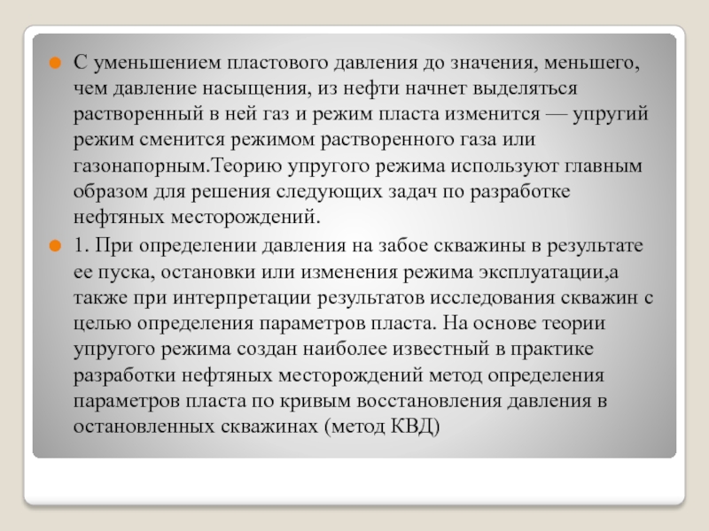 1. При определении давления на забое скважины в результате ее пуска, остановки или изменения режима эксплуатации,а также при интерпретации результатов исследования скважин с целью определения параметров пласта. На основе теории упругого режима создан наиболее известный в практике разработки нефтяных месторождений метод определения параметров пласта по кривым восстановления давления в остановленных скважинах (метод КВД)