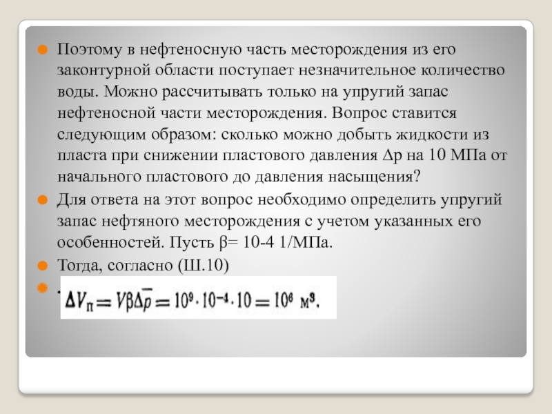 Для ответа на этот вопрос необходимо определить упругий запас нефтяного месторождения с учетом указанных его особенностей. Пусть β= 10-4 1/МПа.