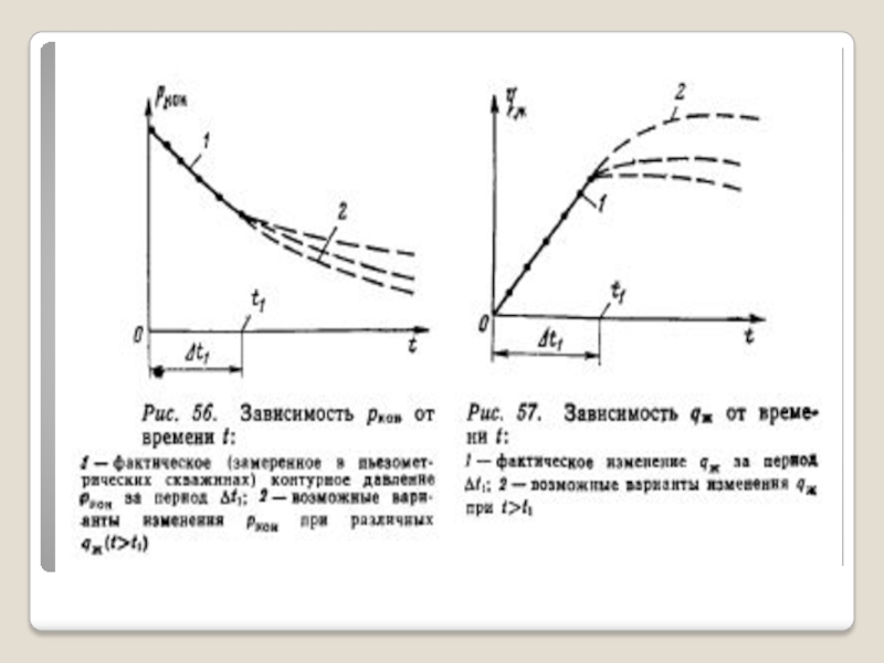 возрастает. За этот период и определено фактическое изменение давления на контуре рк о н . При t>t1 отборжидкости из месторождения изменяется иначе, чем в начальный период: он сначала стабилизируется, а в поздний период разработки снижается.Поэтому просто экстраполировать изменение pкон(t) по имеющейся зависимости ркон=pкон(t) за начальный период разработки ∆t1 нельзя, так как темп отбора жидкости изменится при t>t1. Изменение ркон=pкон(t) прогнозируют на основе решения соответствующих задач теории упругого режима.