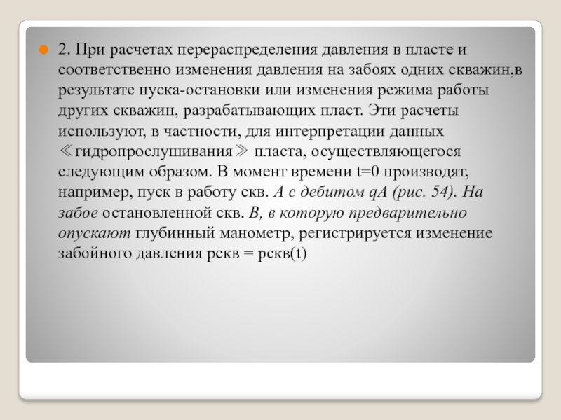 Слайд 62. При расчетах перераспределения давления в пласте и соответственно изменения