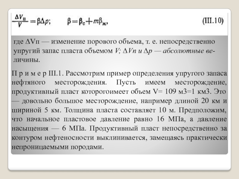 и м е р III.1. Рассмотрим пример определения упругого запаса нефтяного месторождения. Пусть имеем месторождение, продуктивный пласт которогоимеет объем V= 109 м3=1 км3. Это — довольно большое месторождение, например длиной 20 км и шириной 5 км. Толщина пласта составляет 10 м. Предположим, что начальное пластовое давление равно 16 МПа, а давление насыщения — 6 МПа. Продуктивный пласт непосредственно за контуром нефтеносности выклинивается, замещаясь практически непроницаемыми породами.