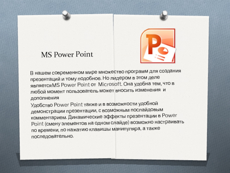 Power Point от Microsoft. Она удобна тем, что в любой момент пользователь может вносить изменения и дополненияУдобство Power Point также и в возможности удобной демонстрации презентации, с возможным послайдовым комментарием. Динамические эффекты презентации в Power Point (смену элементов на одном слайде) возможно настраивать по времени, по нажатию клавишы манипуляра, а также последовательно.