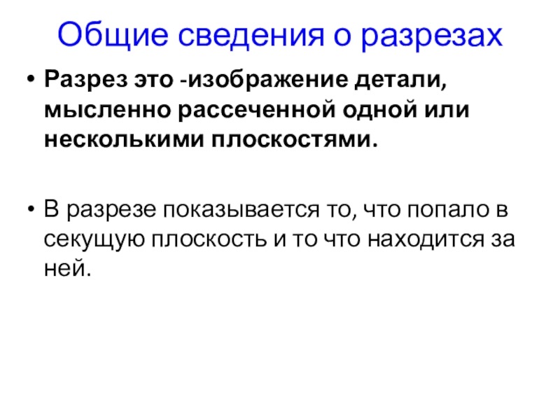 Общие сведения о разрезахРазрез это -изображение детали, мысленно рассеченной одной или несколькими плоскостями.В разрезе показывается то, что