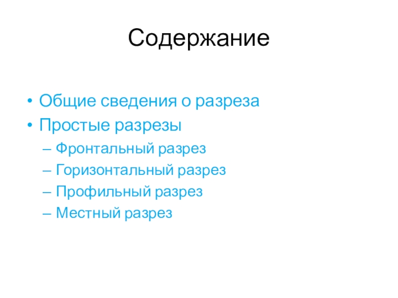 СодержаниеОбщие сведения о разрезаПростые разрезыФронтальный разрезГоризонтальный разрезПрофильный разрезМестный разрез