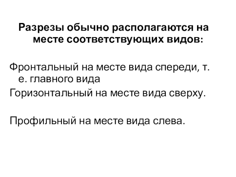 Разрезы обычно располагаются на месте соответствующих видов:Фронтальный на месте вида спереди, т.е. главного видаГоризонтальный на месте вида