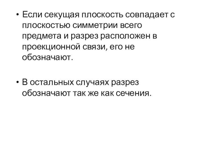 Если секущая плоскость совпадает с плоскостью симметрии всего предмета и разрез расположен в проекционной связи, его не