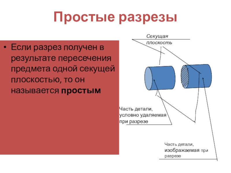 Простые разрезыЕсли разрез получен в результате пересечения предмета одной секущей плоскостью, то он называется простымСекущая плоскостьЧасть детали,условно