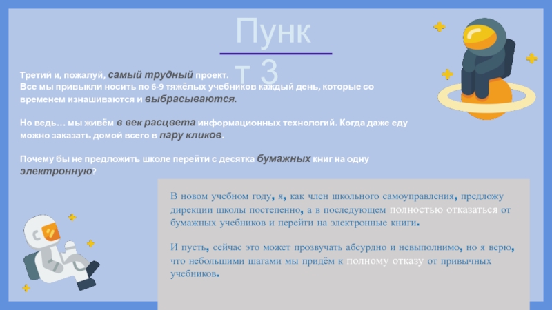 В новом учебном году, я, как член школьного самоуправления, предложу дирекции школы постепенно, а в последующем полностью отказаться от бумажных учебников и перейти на электронные книги.