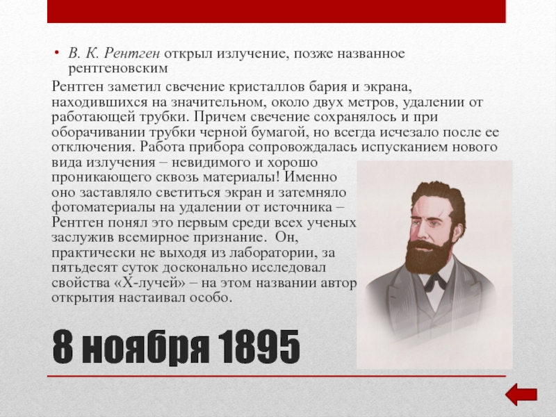 В. К. Рентген открыл излучение, позже названное рентгеновским