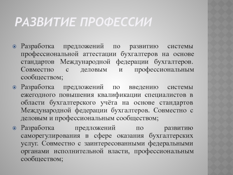 Разработка предложений по развитию саморегулирования в сфере оказания бухгалтерских услуг. Совместно с заинтересованными федеральными органами исполнительной власти, профессиональным сообществом;