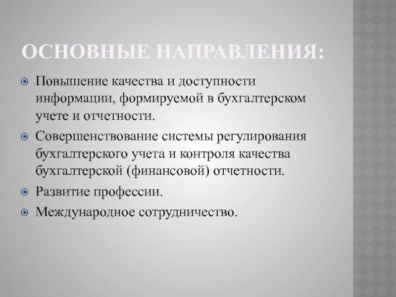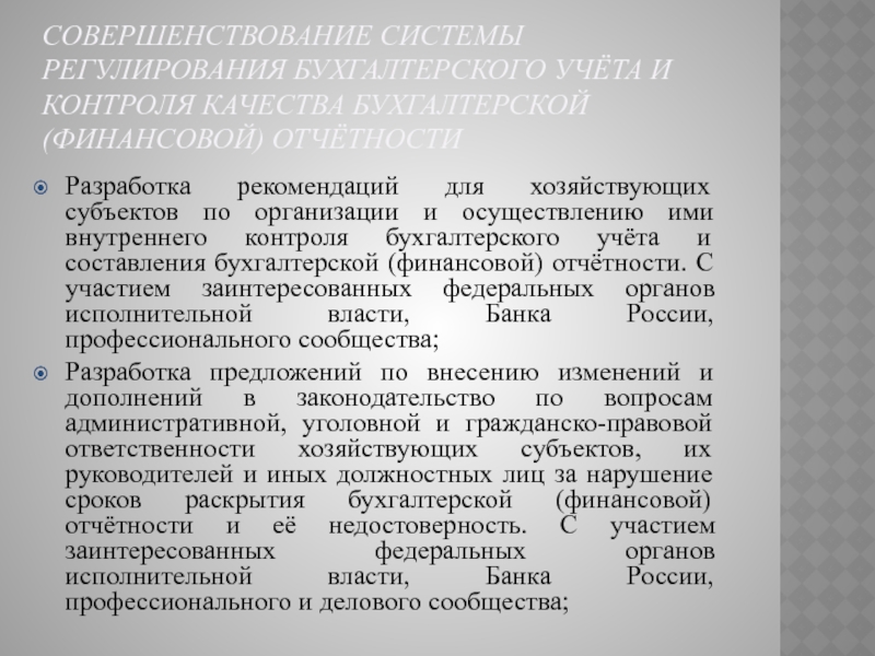 Слайд 10Совершенствование системы регулирования бухгалтерского учёта и контроля качества бухгалтерской (финансовой)
